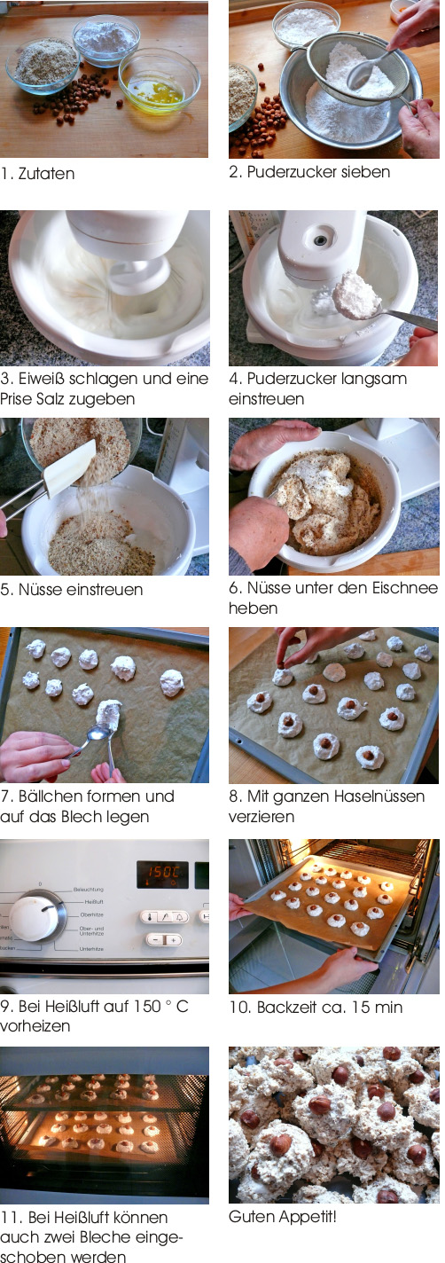 Für Nussliebhaber ein „Muss“. Diese Makronen sind ein herzhaftes Gebäck dem man nicht überdrüssig wird. Die Nussmenge kann auch variiert werden, je nach Geschmack. Die unten angegebene Menge sollte aber immer als Bezugsmenge genommen werden. Weiterhin können bei belieben Backoblaten verwendet werdent. Ich mag die Haselnuss-Makronen lieber ohne Oblaten, die sind immer so trocken.