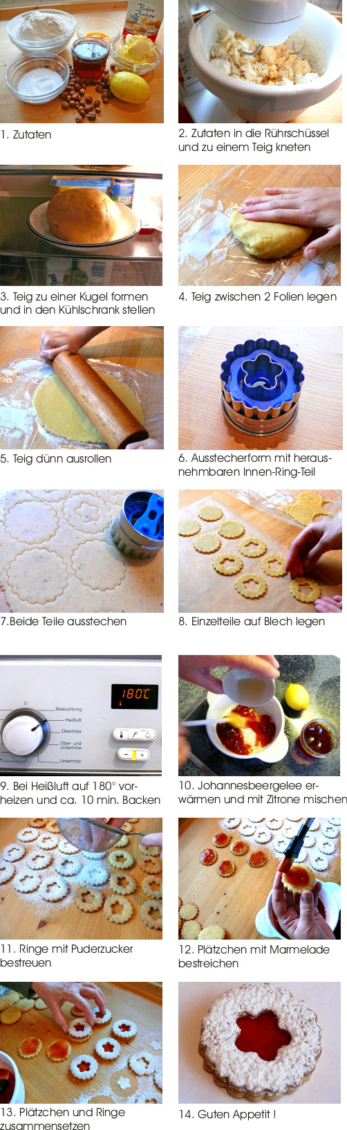 400 g Mehl, 200 g Margarine, 100 g Zucker, 1 Päckchen Vanillinzucker, 50 g. geriebene Haselnüsse, 40 g Puderzucker, 3 Eigelb, ½ Tasse Johannisbeergelee, abgeriebene Schale einer haben Bio-Zitrone, Saft einer ½ Zitrone.